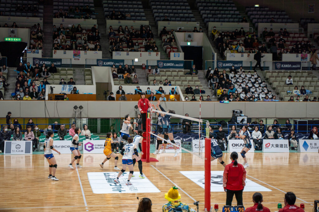 会場に到着すると、まず目に飛び込んできたのはカノアラウレアーズ福岡のチームカラーで彩られた会場と、すでに熱気に包まれた観客席。